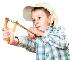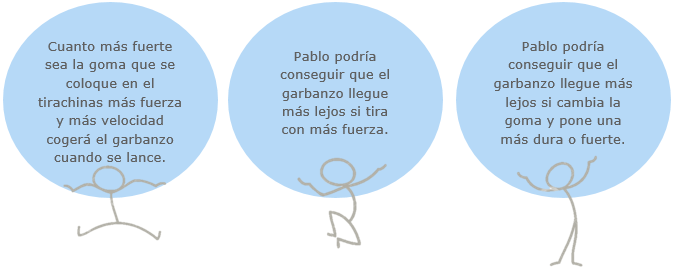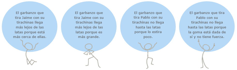 Los hermanos Sánchez, Pablo y Jaime tienen ocho y seis años respectivamente. Han decidido hacer un tirachinas cada uno para jugar a derribar latas de refrescos vacías colocadas encima de una mesa a una distancia de 10 o más metros de ellos, poniendo en práctica su puntería. Cada uno ha utilizado distintos materiales para construirlo. Para derribar las latas, ambos utilizan garbanzos como proyectil, colocándolos en el extremo del tirachinas. Los dos tiraron varias veces a las latas y siempre el proyectil de Jaime llegaba a más distancia de donde estaban las latas, sobrepasándolas, mientras que el de Pablo no llegaba nunca a las latas. |