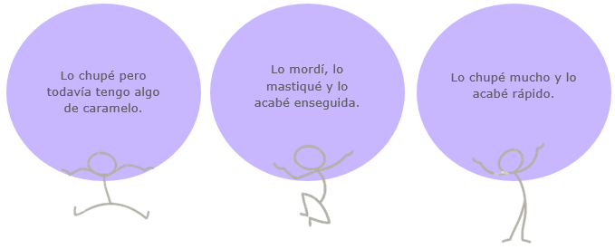 El pasado viernes fue el cumpleaños de la profesora de la clase de Pablo y como recompensa por portarse bien la clase, repartió caramelos a todos los alumnos. Para que no hubiera revuelo, les pidió que no comenzasen a comerlo hasta que no se lo hubiera repartido a todos. Cuando la profesora indicó, los alumnos desenvolvieron su caramelo y se lo metieron en la boca. Al cabo de aproximadamente diez minutos y con la intención de continuar la clase, la profesora preguntó si todos habían acabado su caramelo. Algunos tenían una pequeña parte del caramelo aún en la boca, otros hacía ya un rato que lo habían acabado y al resto, sin embargo, todavía les quedaba un trozo bastante grande en su boca, el cual saboreaban con gran placer. |