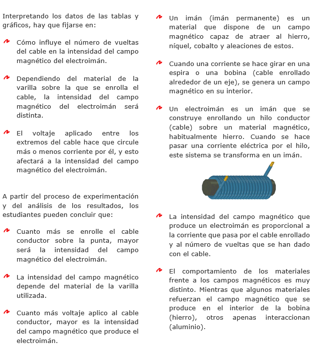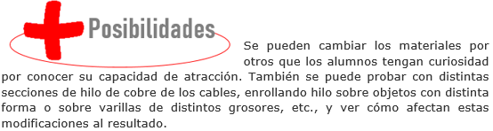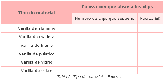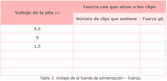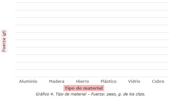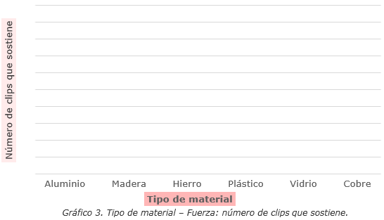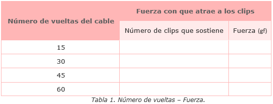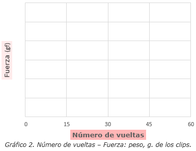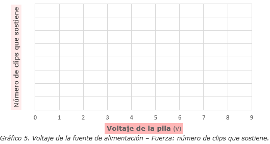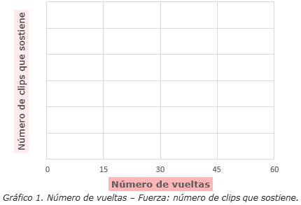 Dado que 1 clip de tamaño normal de acero = 1 g., para cada uno de los experimentos en la variable dependiente la cantidad de clips y su peso son magnitudes directamente proporcionales (por ejemplo, si el electroimán sostiene 11 clips la fuerza será de 11 gf, sin necesidad de báscula). En los gráficos siguientes ambas representaciones resultantes por medio de líneas o columnas serán iguales cada uno de los experimentos. Es por este motivo que en la ‘Ficha del alumno’ se presenta una tabla con dos columnas y un único gráfico por experimento.