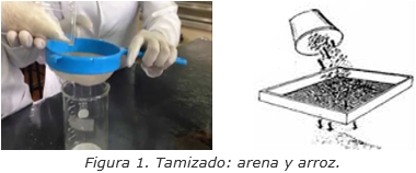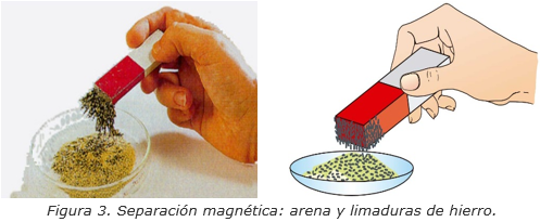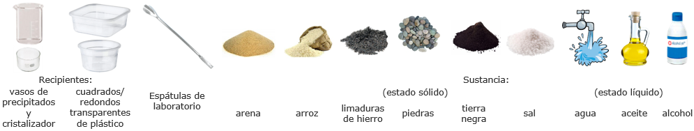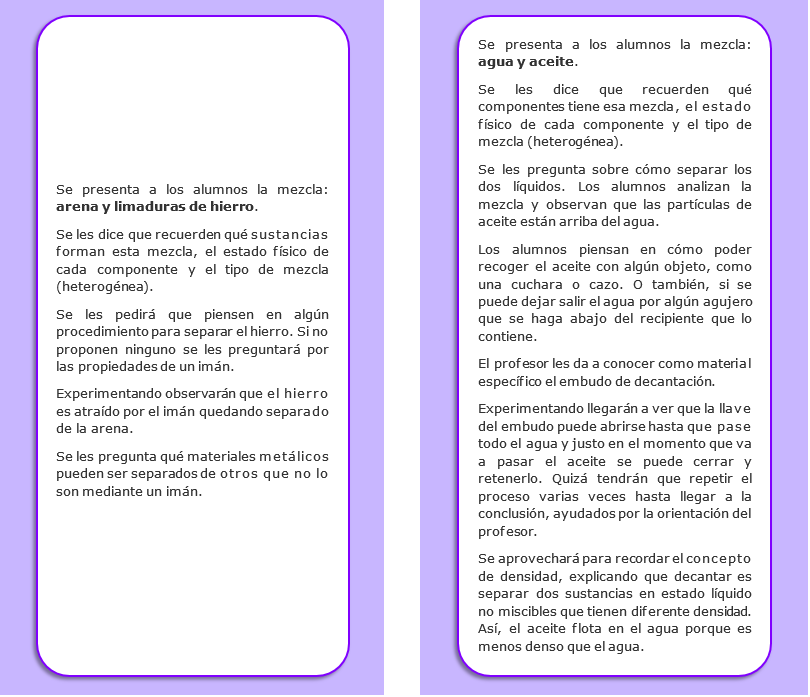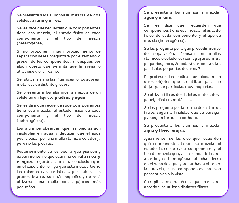 - El profesor orientará el proceso de enseñanza y aprendizaje, formulando preguntas sobre las características de los componentes de las mezclas, especialmente sobre aquella(s) que diferencien a las sustancias y que puedan utilizarse para poder separarlas. Por ejemplo, al analizar la mezcla 1 (arena y arroz), procurará que se fijen en la característica ‘tamaño’ que diferencia a las sustancias. En las mezclas 2, 3 y 4 (agua y piedras/arroz/arena), además del estado de agregación también se diferencian en el grosor o tamaño. En la mezcla 6 (arena y hierro) pensarán sobre las propiedades de un imán. En la mezcla 7 (agua y aceite) se pueden fijar en que una flota sobre la otra.