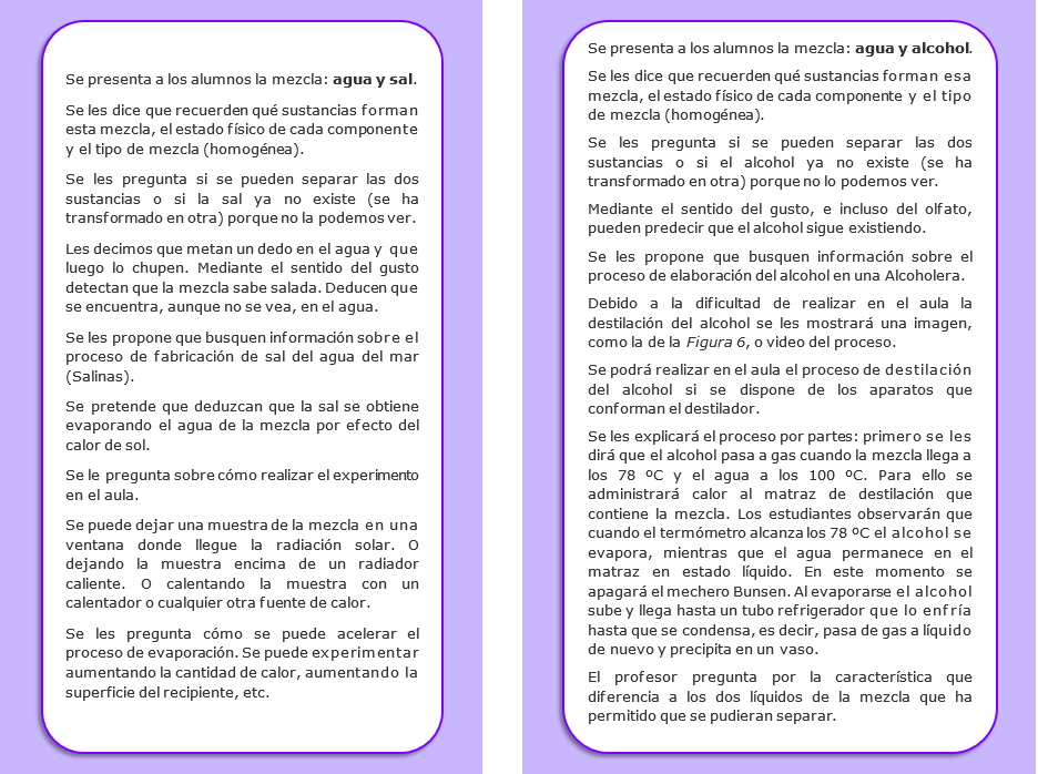 - Los estudiantes tienen más dificultad para proponer métodos para separar los componentes de las mezclas homogéneas. Por eso, el profesor les propondrá que busquen información en Internet, por ejemplo, sobre la fabricación de sal en las Salinas o la elaboración del alcohol en las Alcoholeras.