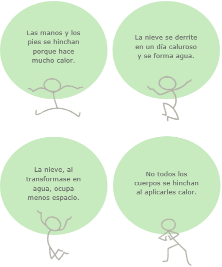 Juan va paseando por el campo un día muy caluroso y nota cómo se le hinchan los dedos de sus manos y los pies dentro de sus zapatillas de deporte. Se pregunta si esto tiene algo que ver con el calor que hace y si este calor también afecta a los objetos que le rodean, por ejemplo, a la nieve que hay en lo alto de unas montañas lejanas. |