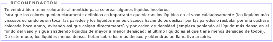 Piensa cómo puedes formar el arcoíris del vaso de la Situación problematizadora (Figura 1. Vaso con líquidos de muchos colores.), selecciona los líquidos a mezclar y realiza el experimento para ver si realmente consigues formar el arcoíris.