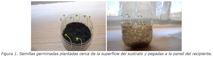 - A la hora de plantar las semillas germinadas, se recomienda no compactar demasiado el sustrato. Además, es conveniente plantarlas cerca de la superficie y pegadas a la pared del recipiente (véase Figura 1), así tardarán menos en brotar y se podrá observar mejor el proceso.