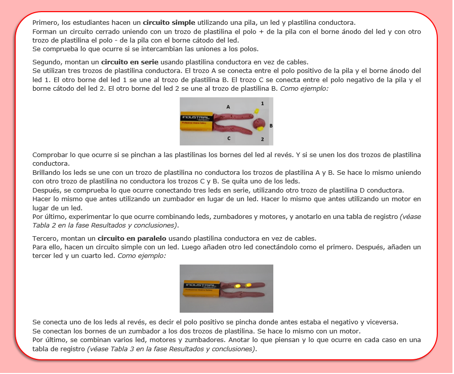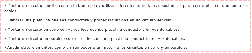 - No hay que conectar los diodos led directamente a la pila de 9V, pues estos funcionan con un voltaje de entre 1,5 y 3V y se estropearían. Los alumnos deben saber que en un circuito en serie la suma del voltaje que soporta cada bombilla debe ser similar al voltaje de la pila, mientras que en un circuito en paralelo cada bombilla puede soportar un voltaje similar al de la pila.