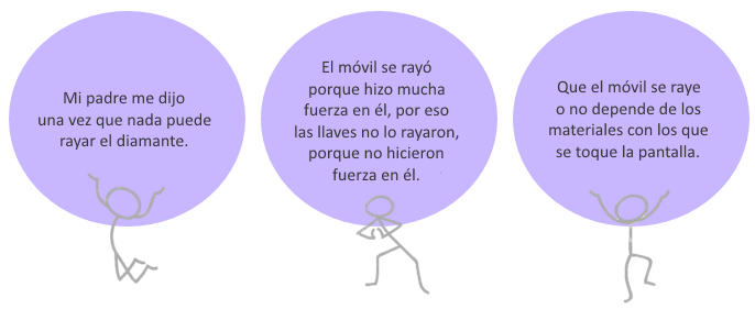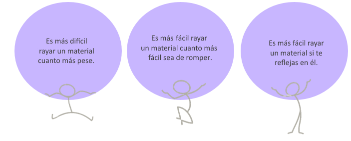 En la Naturaleza existen materiales o sustancias muy diversos que tienen características distintas que los diferencias entre sí. Una de estas características en la dureza, hay sustancias blandas como: queso, yeso, caucho, piel, etc., y otras duras, como el acero, diamante, oro... Para averiguar la dureza de las materiales o sustancias existentes en la Naturaleza los científicos han utilizado el criterio de identificar la dureza con la resistencia que opone el material/sustancia a dejarse rayar por otro. En verano Hugo fue de vacaciones a la playa y, mientras estaba haciendo un castillo de arena quiso mirar en el teléfono móvil de su madre fotos de castillos de arena. En cuanto terminó de mirar el móvil se dio cuenta de que la pantalla estaba rayada y él tenía las manos llenas de arena. Hugo se quedó especulando en el motivo del rayado del móvil, pensó en que su madre no había rayado nunca el móvil y eso que lo lleva habitualmente en el bolso junto a las llaves. Además, él nunca había rayado el móvil con las manos, por lo que tenía que tratarse de la arena. |