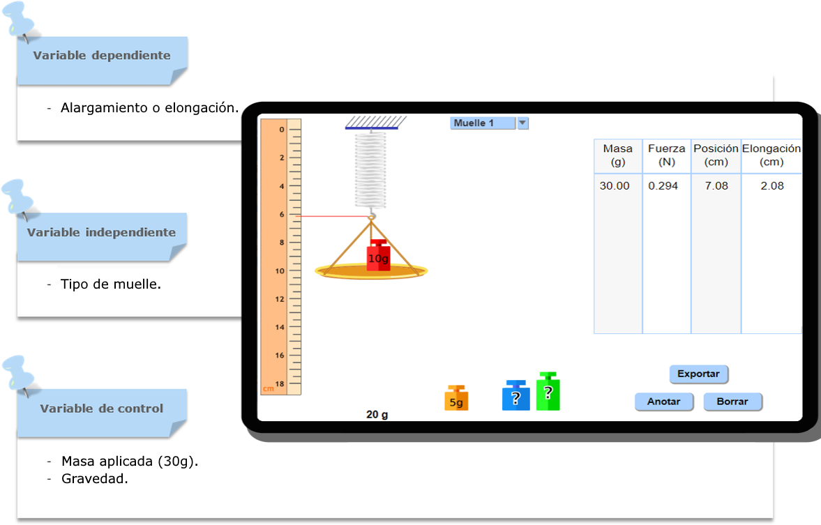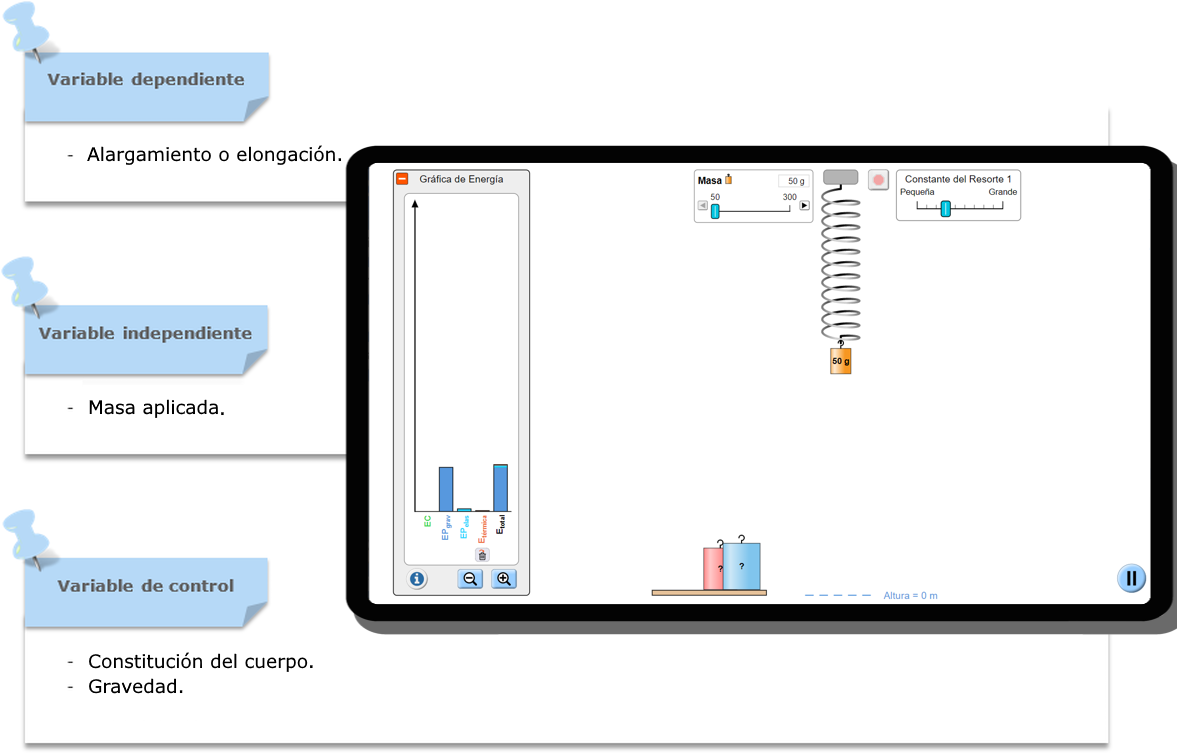 Utiliza la simulación del laboratorio virtual del PhET (haciendo clic en el apartado de "Laboratorio") y elabora una tabla con cinco valores de la variable independiente y los resultados de la variable dependiente. Realiza también la gráfica correspondiente: