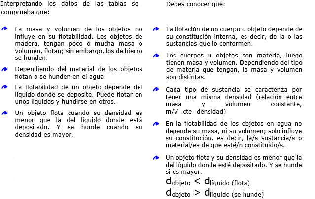 A través de los resultados de las dos tablas sobre la contrastación de la primera hipótesis se constata que los objetos macizos de madera, independientemente de la masa que tienen siempre flotan en agua; sin embargo, los objetos de plastilina se hunden en agua. Se puede interpretar que la masa no influye en la flotabilidad de objetos macizos. Parece que, dependiendo del material del que esté echo el objeto, flota (por ejemplo, la madera) o se hunde (por ejemplo, la plastilina). Flotan los objetos de densidad menor que la del líquido donde está depositado y se hunden los de mayor densidad.