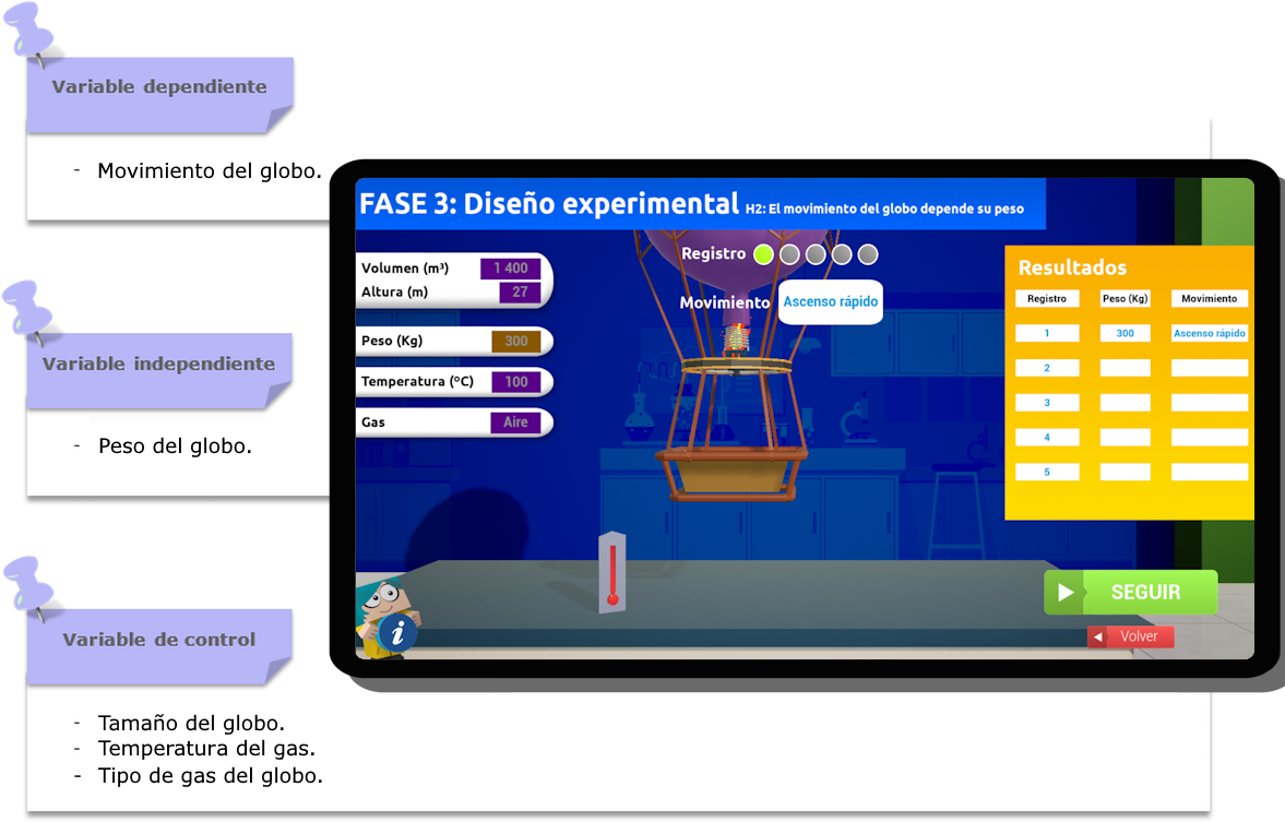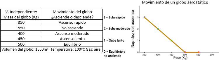 Utiliza la simulación de la indagación 10: Vuelo en globo de IndagApp y elabora una tabla con los cinco valores de la variable independiente "Peso del globo" que se indican en las dos primeras columnas. Poner los datos de las variables de control en la última fila de cada tabla: