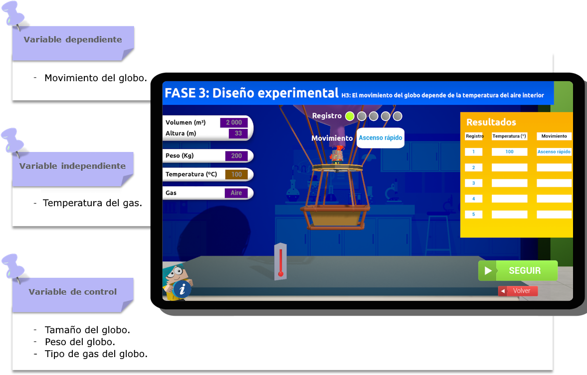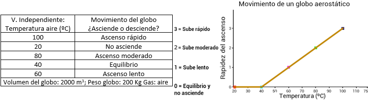 Utiliza la simulación de la indagación 10: Vuelo en globo de IndagApp y elabora una tabla con los cinco valores de la variable independiente "Temperatura del aire" que se indican en la primera columna. Poner los datos de las variables de control en la última fila de cada tabla: