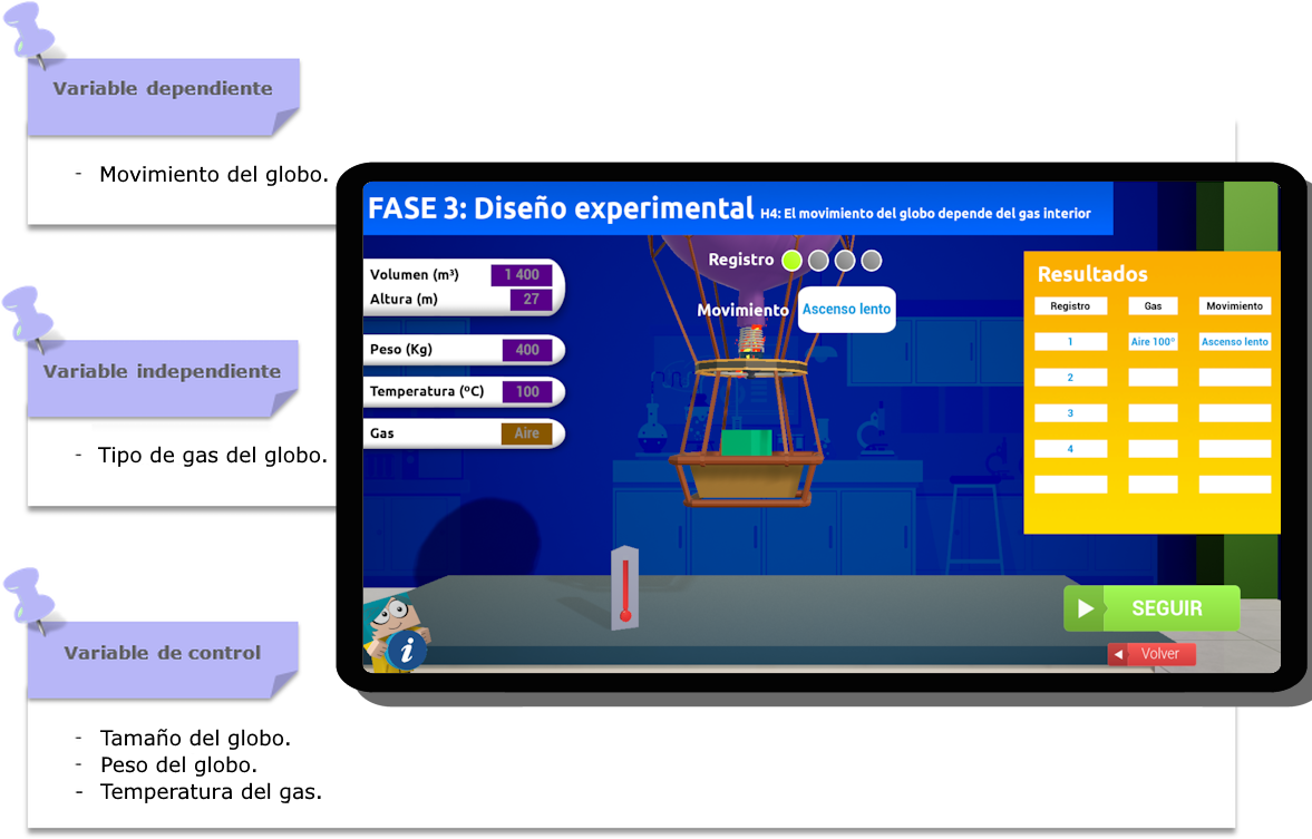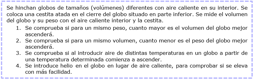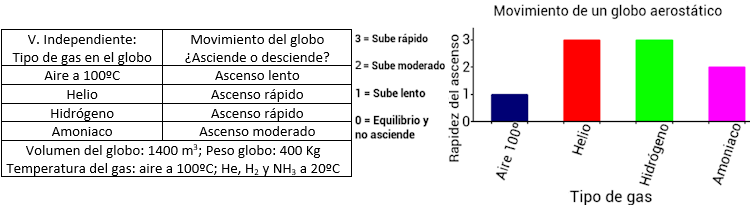 Contrastar la hipótesis 4 - Experimento 4 - Variables 4 Utiliza la simulación de la indagación 10: Vuelo en globo de IndagApp y elabora una tabla con los cinco valores de la variable independiente "Tipo de gas" que se indican en la primera columna. Poner los datos de las variables de control en la última fila de cada tabla: