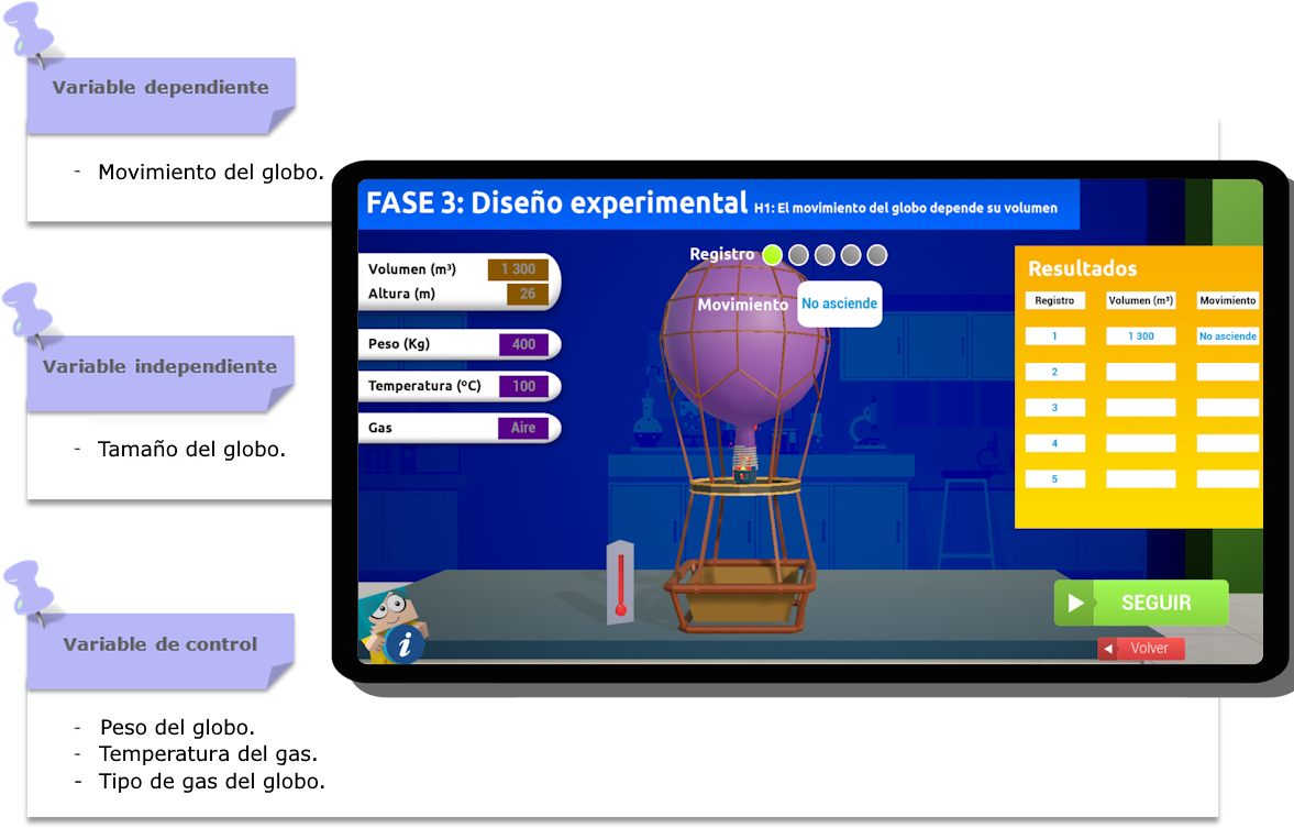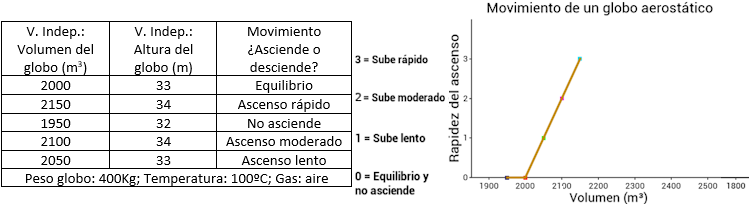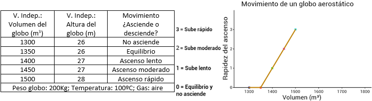 Utiliza la simulación de la indagación 10: Vuelo en globo de IndagApp y elabora una tabla con los cinco valores de la variable independiente "Volumen y altura del globo" que se indican en las dos primeras columnas. Poner los datos de las variables de control en la última fila de cada tabla: