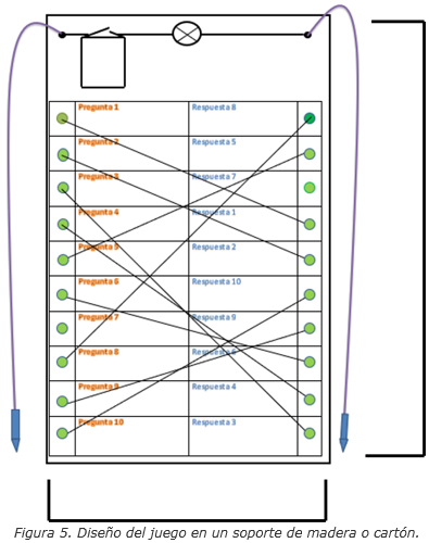Los distintos grupos de alumnos primero piensan en el circuito y dibujan un esquema del mismo para que cuando se conecte uno de los dos cables que tiene el juego con una pregunta y el otro con la respuesta correcta se cierre el circuito y, sin embargo, cuando se conecte con una respuesta errónea el circuito quede abierto.