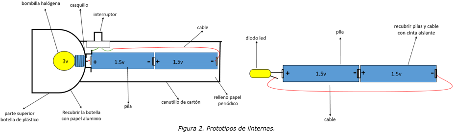 Tras la elección de la propuesta resolutiva, los alumnos en grupo deben realizar un diseño de la linterna. Primero, dibujándola. Es aconsejable potenciar el uso de dibujo de bocetos, de tal forma que los alumnos, a la par que verifican la viabilidad de la solución, visualicen las posibles dificultades que se pueden encontrar en su ejecución. Posibles diseños: