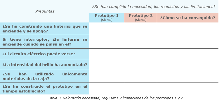 Al igual que en la fase anterior, los miembros del grupo anotarán los resultados en una tabla comparativa entre los prototipos 1 y 2, donde quedará reflejado si con el segundo prototipo se satisfacen o no las necesidades que el primero no cumplía: