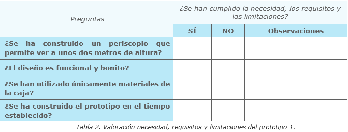 Tras probarlo pueden darse errores en el proceso de construcción del prototipo o que el diseño planificado no responda a la solución. Los alumnos anotarán estos resultados en una tabla para comprobar si el prototipo 1 cumple los requisitos y limitaciones y satisface la necesidad: