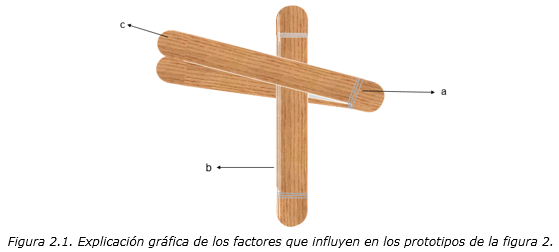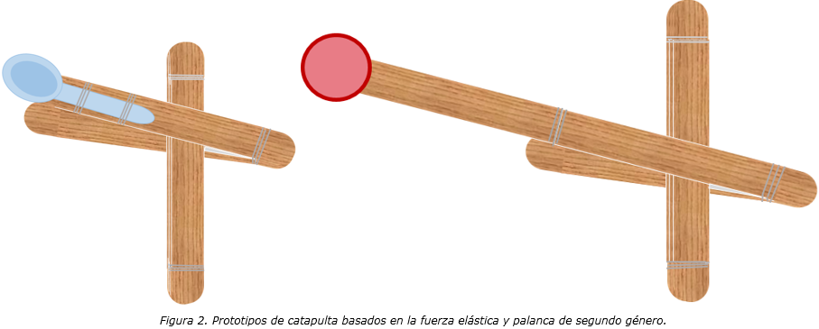 Respecto a los prototipos de la figura 2, el profesor ayudará a que los grupos de estudiantes analicen o consideren los tres factores que influyen en la fuerza ejercida sobre el proyectil de la catapulta y, por lo tanto, en su velocidad de salida o en la distancia que alcance, son: