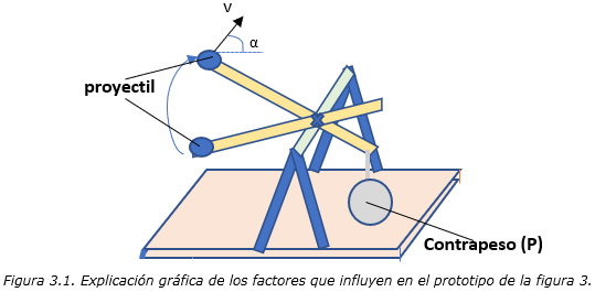 Respecto al prototipo de la figura 3, el profesor ayudará a que los grupos de estudiantes analicen o consideren los tres factores que influyen en la fuerza ejercida sobre el proyectil de la catapulta y, por lo tanto, en su velocidad de salida o en la distancia que alcance, son: