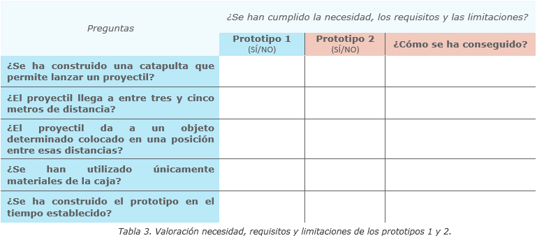 Al igual que en la fase anterior, los miembros del grupo anotarán los resultados en una tabla comparativa entre los prototipos 1 y 2, donde quedará reflejado si con el segundo prototipo se satisfacen o no las necesidades que el primero no cumplía: