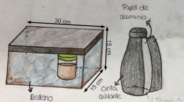 Tras la tormenta de ideas y elección de la propuesta resolutiva, los alumnos en grupo deben realizar un diseño del termo. Primero, dibujándolo. Es aconsejable potenciar el uso de dibujo de bocetos, de tal forma que los alumnos, a la par que verifican la viabilidad de la solución, visualicen las posibles dificultades que se pueden encontrar en su ejecución. Debatiendo en pequeños grupos surgen ideas de todo tipo: crear un recipiente similar a un termo convencional, introducir un recipiente en otro que sea bastante más grande o casi del mismo tamaño, taparlo o no taparlo, etc. Posibles diseños: