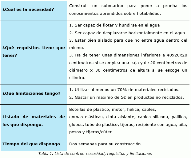 En indagaciones previas, los alumnos han trabajado sobre la flotabilidad de los objetos y, por ello, sobre la densidad de los mismos. El reto que les propone la maestra es utilizar los conocimientos aprendidos para fabricar un producto que tenga utilidad, en este caso, un submarino.