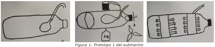 Tras la tormenta de ideas y elección de la propuesta resolutiva, los alumnos en grupo deben realizar un diseño del submarino. Primero, dibujándolo. Es aconsejable potenciar el uso de dibujo de bocetos, de tal forma que los alumnos, a la par que verifican la viabilidad de la solución, visualicen las posibles dificultades que se pueden encontrar en su ejecución. Debatiendo en pequeños grupos surgen ideas de todo tipo: crear un recipiente similar a un submarino convencional, introducir aire dentro de un recipiente para que se hinche, formas de aislar el producto, etc. Posibles diseños: