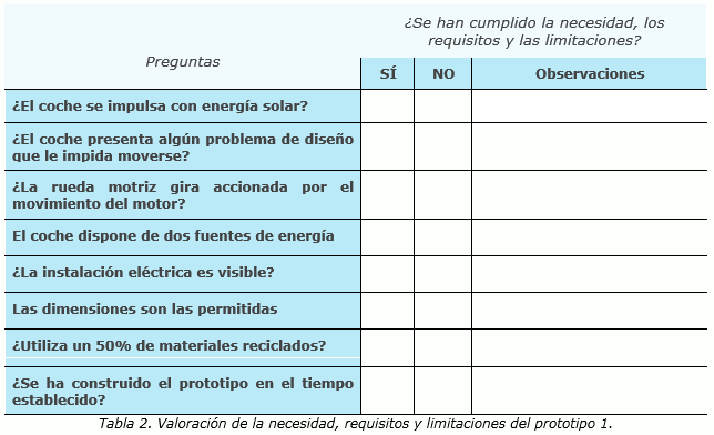 Tras probarlo pueden darse errores en el proceso de construcción del prototipo o que el diseño planificado no responda a la solución. Los alumnos anotarán estos resultados en una tabla para comprobar si el prototipo 1 cumple los requisitos y limitaciones y satisface la necesidad:
