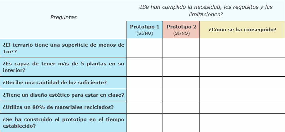 El prototipo 1 no es el definitivo. Los grupos realizarán una mejora de su terrario inicial en función de los comentarios realizados por sus compañeros en la fase anterior y las nuevas ideas surgidas entre los miembros del grupo. Estas modificaciones junto con los puntos fuertes serán recogidas de manera escrita y dibujada en la ‘Ficha del alumno’.